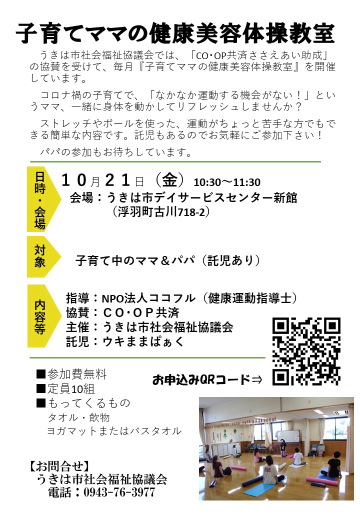 うきは市社会福祉協議会では、「CO・OP共済ささえあい助成」の協賛を受けて、毎月『子育てママの健康美容体操教室』を開催しています。