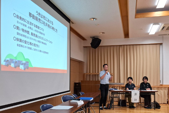 今回の研修会では、旧吉井町域にて移動販売を行っている、移動スーパーとくし丸の岩下さん、Aコープ九州の靏野さん、セブン-イレブンうきはバイパス店オーナーの原口さんを講師にお招きし、移動販売の状況等についてご説明いただきました。