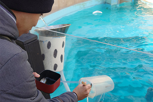 ショーを見たあとは、グループに分かれて行動し、水族館内を散策。大きな水槽で魚が泳ぐ姿を見たり、イルカの餌やり体験をしたりして、普段なかなかできない体験ができたと大変喜ばれ、記念になるようなお土産を購入されている方も多くいらっしゃいました。