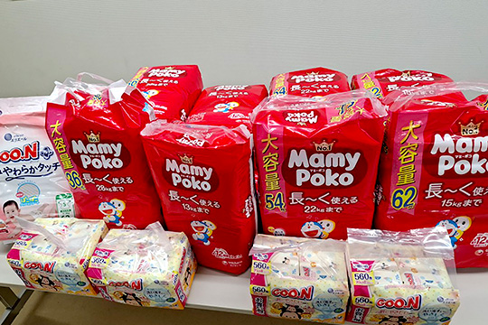 また、お寄せいただきました寄付金をご活用し、支援用の食料品の他、子ども用紙おむつや乳幼児用品、栄養補助食品等を購入し、お渡しをさせていただきました。