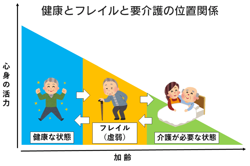 フレイルとは、虚弱や老衰などを意味する「Frailty(フレイルティ)」が語源となり、加齢による心身の活力(運動機能や認知機能等)が低下した状態で、健康な状態と要介護状態の中間の時期を言います。
